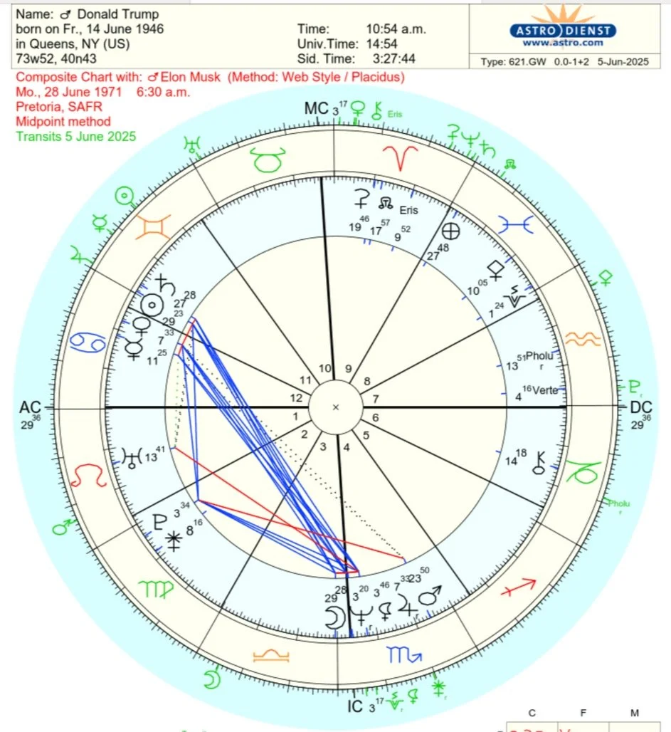 The inner wheel is the composite chart between Trump and Musk; using the Midpoint Method. The green planets on outer wheel are the current transits.
