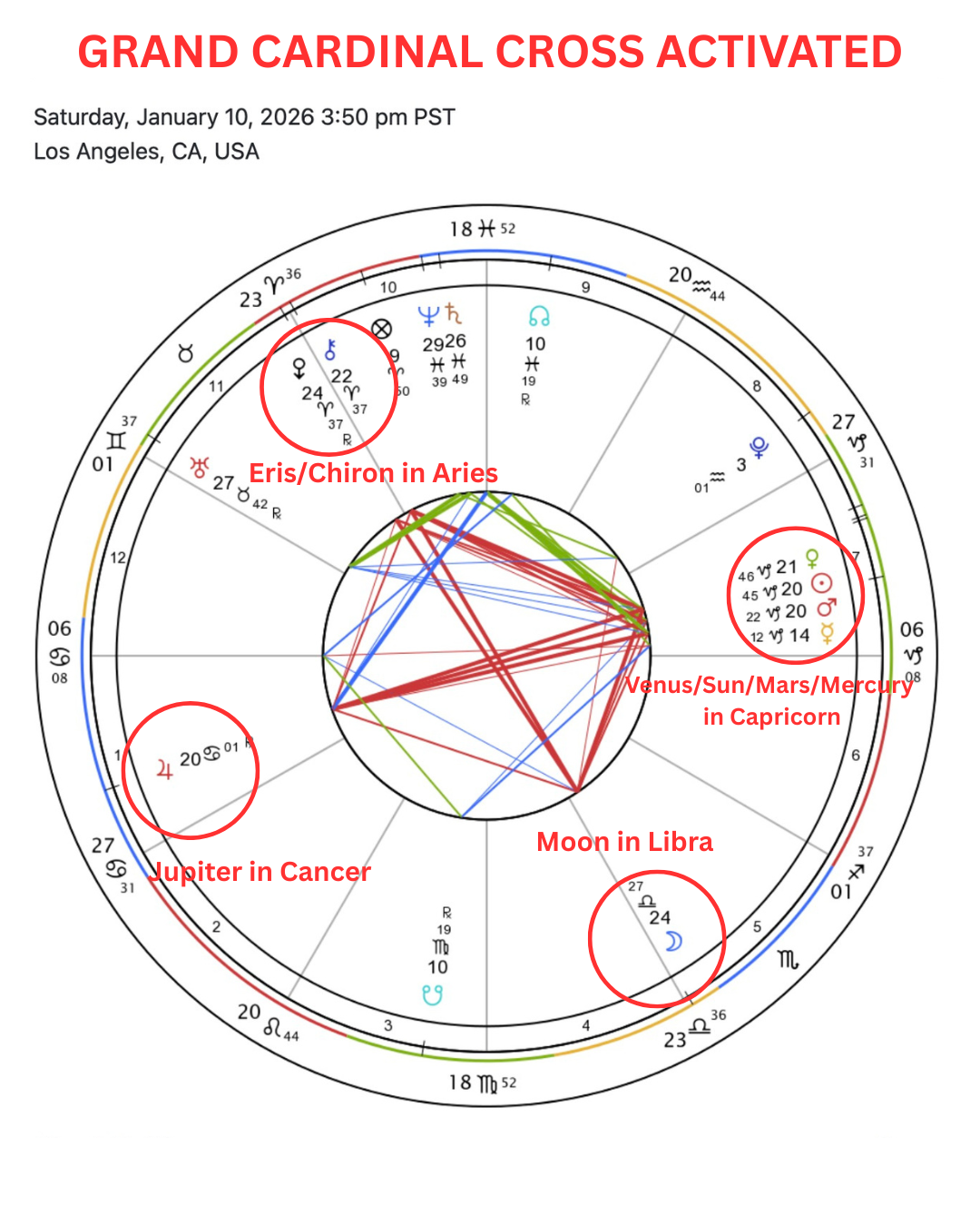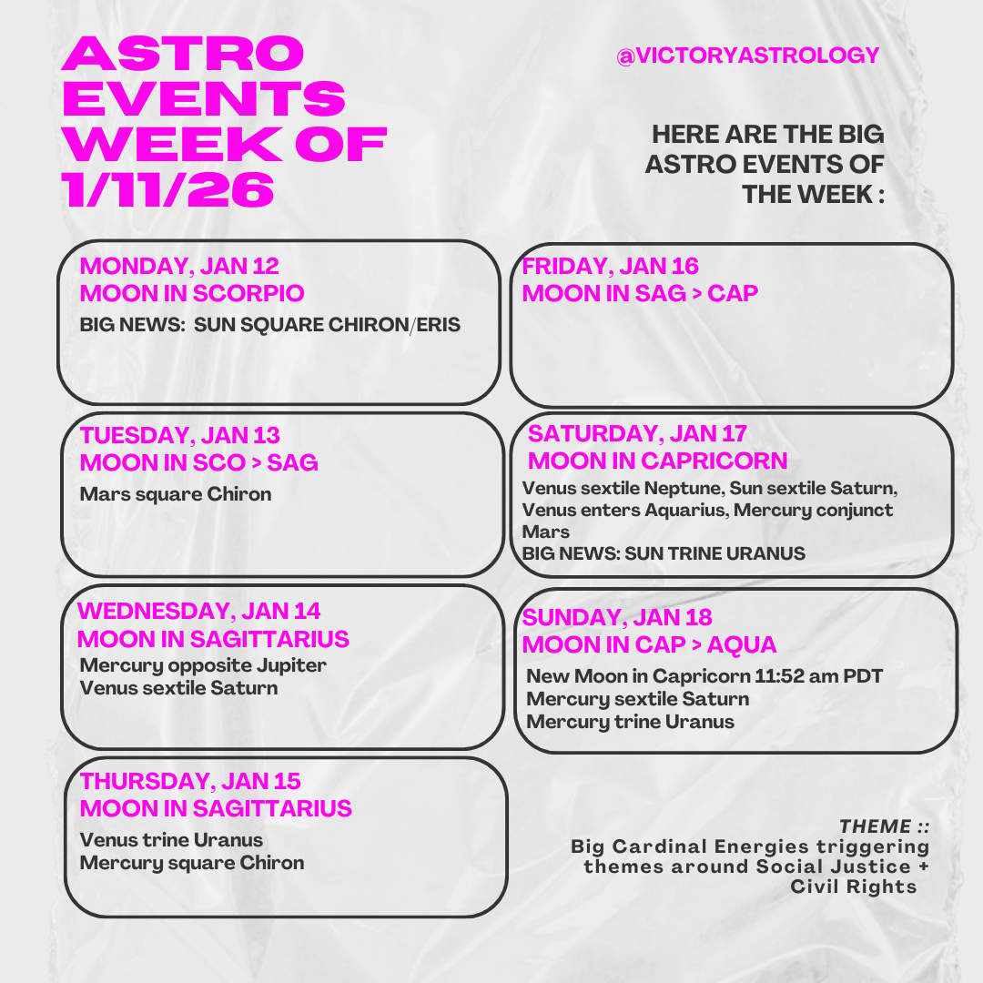 Whatever takes place this weekend, even behind the scenes, is very important. The Moon is connecting with Eris (who is stationing Direct on 1/11, and is VERY potent in standing up to oppressors) and Chiron (wounded warriors/toxic masculine); Jupiter in Cancer (love for our fellow Americans/neighbors/families); and the Venus/Sun/Mars/Mercury stellium in Capricorn (the govt. using all forces against us, including propaganda).